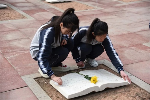 纪念馆前,师生整齐列队,神情庄严肃穆,国旗班的同学向英雄烈士敬献花篮,缅怀先辈们的丰功伟绩。