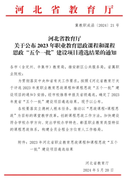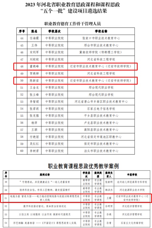 2024年5月20日,河北省教育厅下发《河北省教育厅关于公布2023年职业教育课程思政课程和课程思政“五个一批”建设项目遴选结果的通知》,我校董艳峰和陈新苗两位班主任老师入选河北省职业教育德育工作骨干管理人员;教务处王霞团队的《电拖为基 智造为国——电力拖动控制线路与技能训练课程思政育人实践》课程思政案例入选河北省职业教育课程思政优秀案例,这是学校在课程思政的理论研究和实践创新中取得的重要标志性成果。