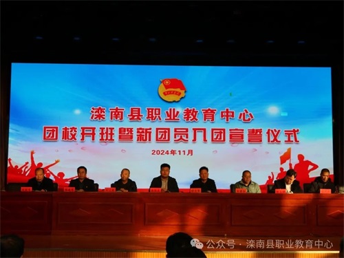 为全面贯彻党的教育方针、落实立德树人根本任务,推进职业教育高质量发展,加强青少年学生的思想政治引领,充分发挥团校的教育阵地作用,11月22日下午,滦南县职业教育中心举行团校开班暨新团员入团宣誓仪式。团县委书记谢秋实,教育局副总督学刘立新,教育局职业教育与成人教育指导中心主任吴建永,校党委副书记、校长杨会军,学校领导班子成员、相关处室负责人、团校教师及600余名团校学员参加活动。活动由副校长张新军主持。