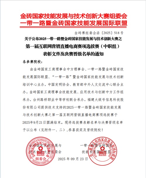 捷报频传!在2025年9月18日举办的“一带一路暨金砖国家技能发展与技术创新大赛之第一届互联网营销直播电商赛项选拔赛”中,我校财经专业部电子商务专业徐菲菲、刘若涵、李若溪、安翔云四位同学组成的参赛小组,凭借扎实的专业功底与出色的实战能力,在全国180支参赛队伍的激烈角逐中脱颖而出,成功斩获团体一等奖第五名的优异成绩,顺利晋级决赛!