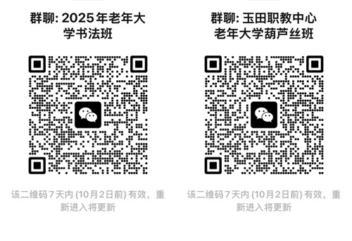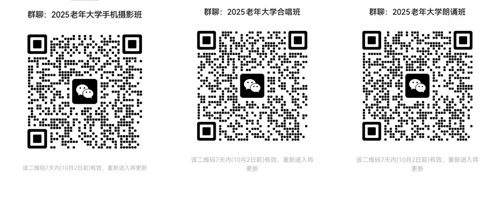 手机摄影班(30人);合唱班(30人);书法(30人);朗诵(30人),葫芦丝(30人)。报名人数超过一半即开班上课。