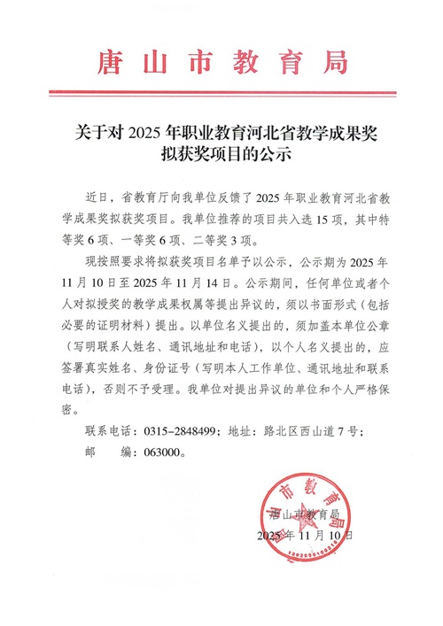 近日,河北省职业教育教学成果奖评选结果正式揭晓,丰南区职教中心产教融合处主任翟成宝主持申报的《产教同频·以岗定策·多元成才:中职机电技术应用专业育人体系创新与实践》项目凭借鲜明的办学特色、显著的育人成效和突出的创新价值,荣膺2025年职业教育河北省教学成果特等奖。这一殊荣不仅是对学校机电专业多年教学改革实践的高度认可,更为区域中职教育产教融合改革树立了标杆,实现了学校在省级职业教育最高教学成果奖项上的重大突破!