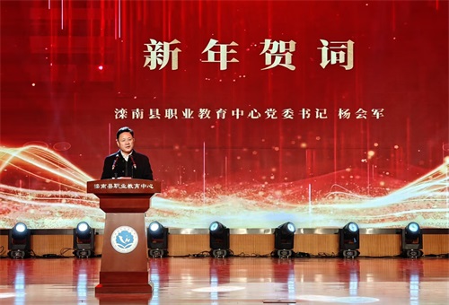 联欢会在激情澎湃的开场舞《薪火相传拓新路》中拉开帷幕。学校党委书记杨会军首先发表新年贺词,他向全体师生、来宾致以诚挚的节日问候,并回顾了过去一年学校在办学改革、产教融合、技能竞赛、对口高考、社会服务等方面取得的卓越成就。杨书记指出:2026年是“十五五”规划开局之年,也是职业教育大有可为、大有作为的机遇之年。他号召全体师生以新年钟声为号角,以昂扬斗志、扎实作风和创新精神,共同谱写滦南职教事业崭新篇章。