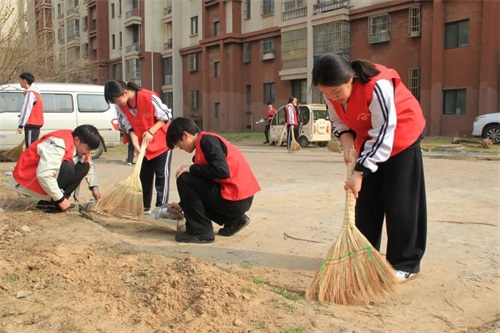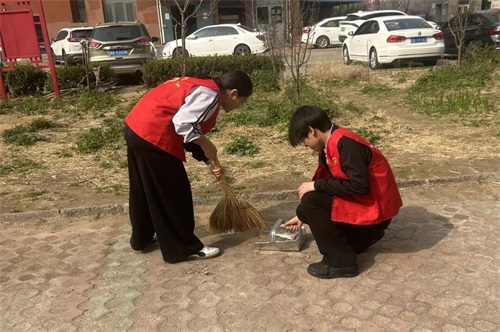 与此同时,卫生清扫志愿服务同步有序开展。同学们手持扫帚、簸箕等工具,深入公共绿地、健身广场等区域,对散落的垃圾、枯枝落叶、卫生死角进行全面清理。大家分工协作、默契配合,不怕脏、不怕累,用汗水清扫社区环境,整洁有序的环境赢得了社区工作人员与居民们的一致好评。
