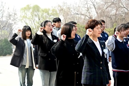 全体师生高举右拳,目光坚定,铮铮誓言响彻陵园,将对英烈的缅怀转化为奋进的力量,表达了听党话、跟党走的赤诚之心。