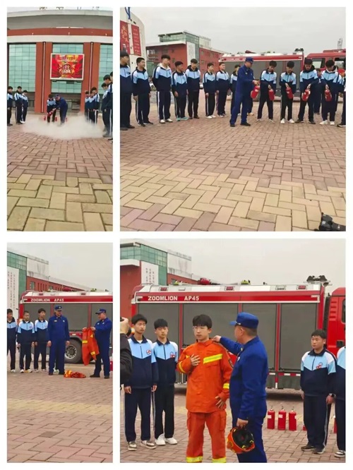 消防培训:邀请市消防救援队消防员到我校现场讲解灭火器的使用方法和消防装备的穿戴,指导学生们实操灭火,学习消防安全技能。
