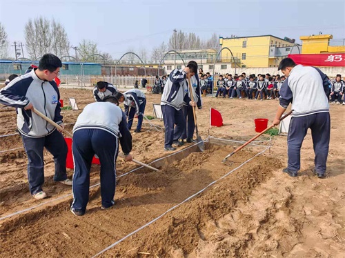 比赛现场,各班级代表队在各自的“责任田”里展开了一场与荒地的“较量”。从手持铁锹深翻破土,到细致平整去除杂质;从拉线起垄打造标准畦面,到精准移栽嫩绿秧苗,再到最后浇水定根。队员们分工明确、配合默契,一套流程如行云流水。经过一番热火朝天的奋战,原本的荒芜土地硬是被同学们“绣”成了一畦畦规整有序、垄行分明的希望田垄。