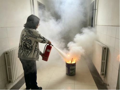 此外,活动还设置了消防安全检查指导、消防专题讲座及灭火器实操环节。消防站负责人对消防站控制室、图信楼及食堂的消防安全设施进行了巡视检查,重点查看了报警设备;消防员结合校园真实案例,讲解了火灾隐患排查、逃生自救等知识;现场示范了干粉灭火器“提、拔、握、压”四步操作法,并指导师生分组实操,帮助大家熟练掌握初期火灾扑救技能。